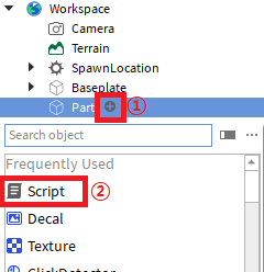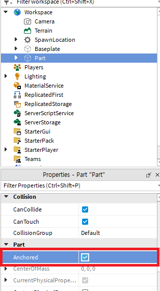 게임을 실행했을 때 파트가 사라지지 않도록 워크스페이스(Workspace)에서 내가 만든 파트를 찾아 클릭하고 파트 설정에서 고정(Anchored)를 체크합니다.