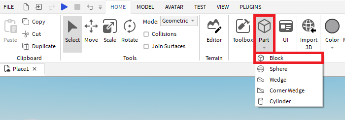 로블록스 스튜디오 상단 메뉴바의 파트(Part)를 클릭하고 원하는 모양을 선택합니다. 저는 네모 블럭을 선택했습니다.
