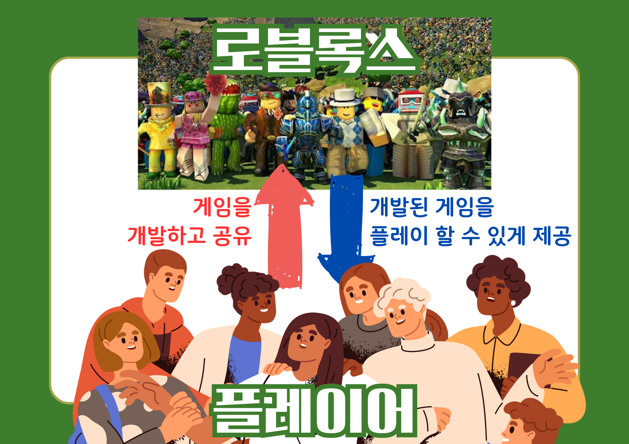 로블록스는 사용자가 직접 게임을 만들고 공유하며 다른 사용자들과 함께 플레이 할 수 있는 샌드박스게임입니다.