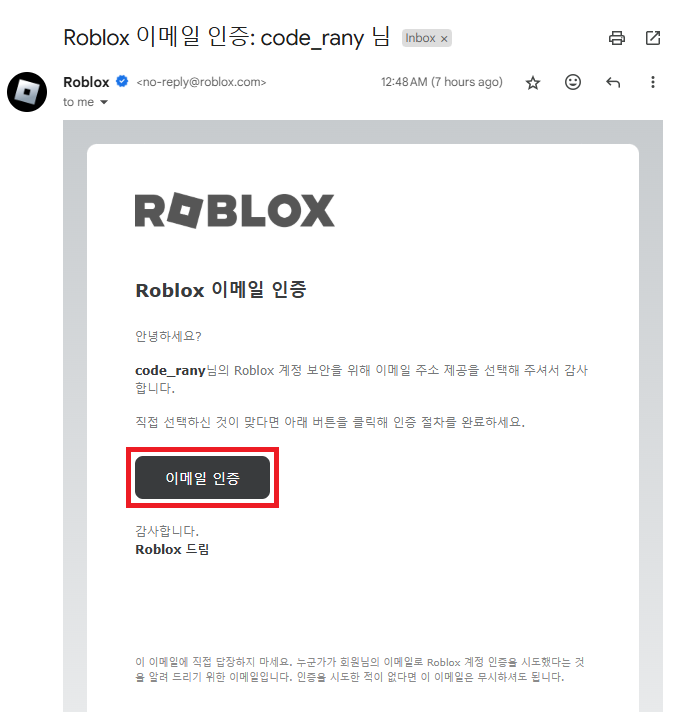 입력한 이메일의 메일함을 확인하면 Roblox 이메일 인증: 000님이라는 이메일을 확인할 수 있습니다.