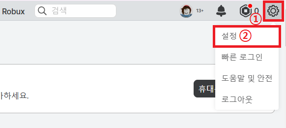 로블록스 페이지 오른쪽 상단의 톱니바퀴(①)를 클릭한 뒤 설정(②)을 클릭합니다.