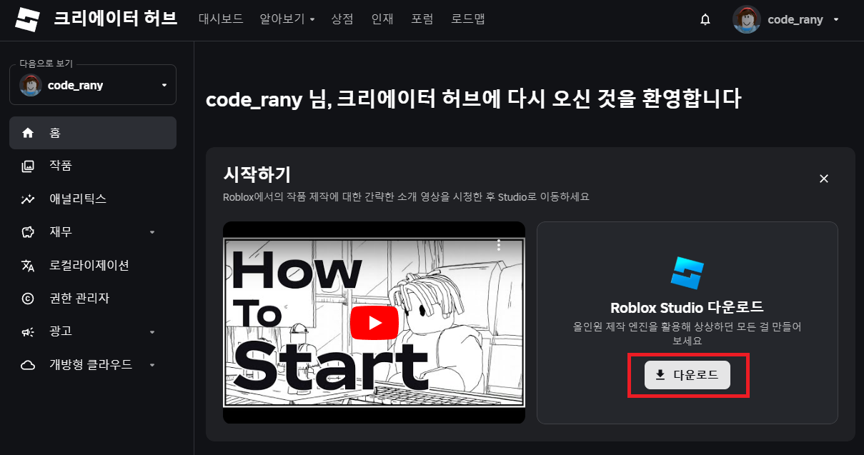 크리에이터 허브의 홈에서 다운로드를 클릭합니다.