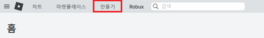 로블록스에 접속한 후, 만들기를 클릭하면 로블록스 게임 개발자를 위한 크리에이터 허브 페이지가 열립니다.