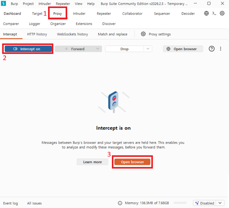 2) 버프슈트의 프록시 메뉴에 들어가 [Intercept on] 상태로 변경 후, 오픈브라우저를 클릭한다.