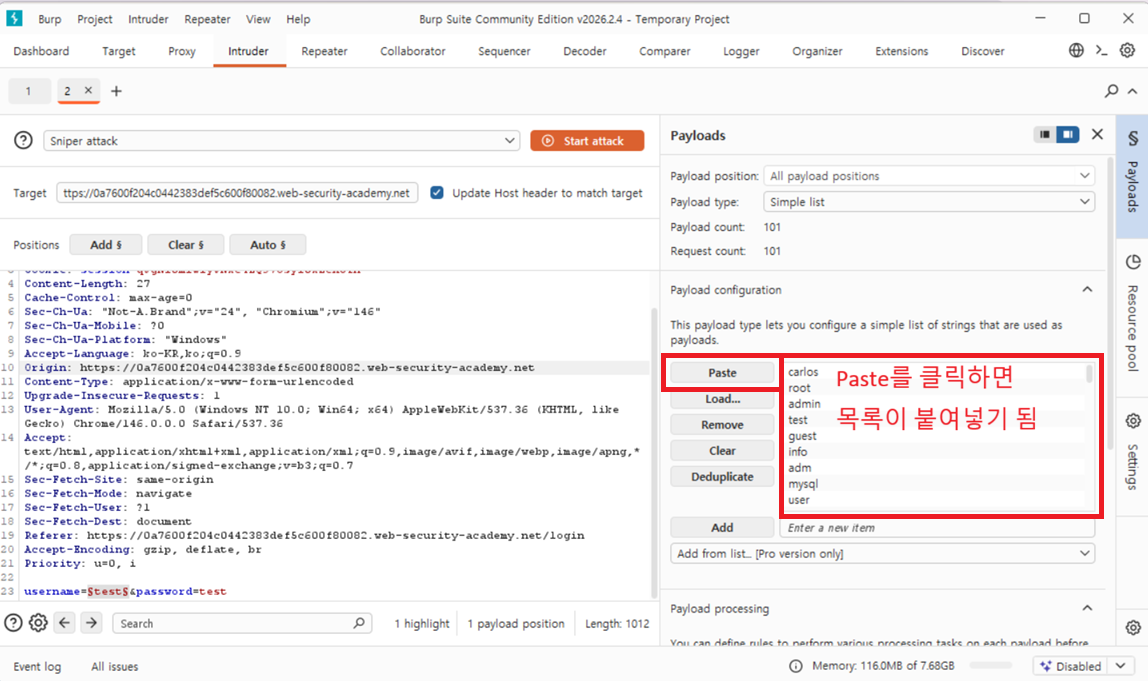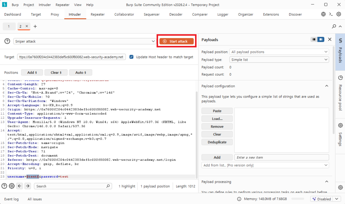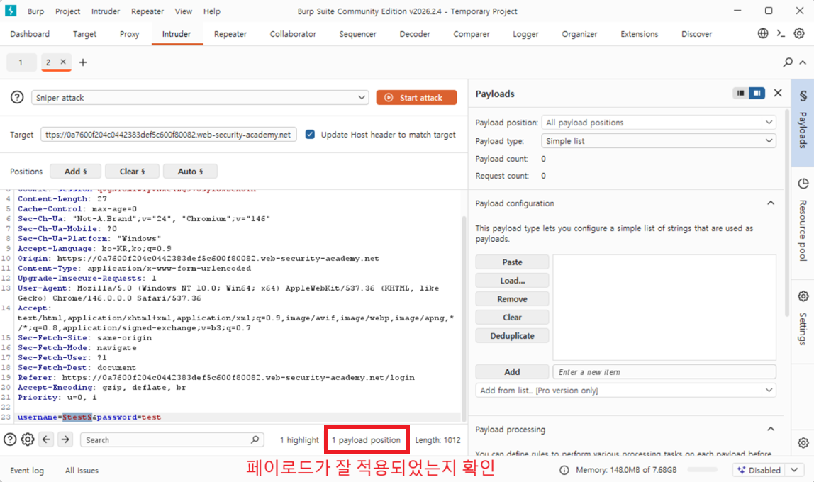 4 Burp Intruder에서 username매개변수가 페이로드 위치로 자동으로 설정되는 것을 확인하세요. 이 위치는 두 개의 기호로 표시됩니다 §(예: username=§invalid-username§). 비밀번호는 일단 임의의 고정 값으로 두세요.