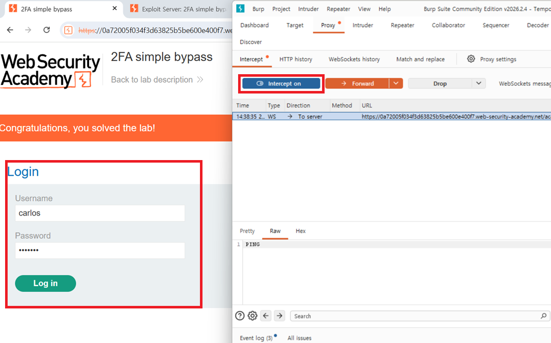 3. 로그인 페이지에서 인터셉트 온 -> 피해자 아이디, 비밀번호 이용하여 로그인