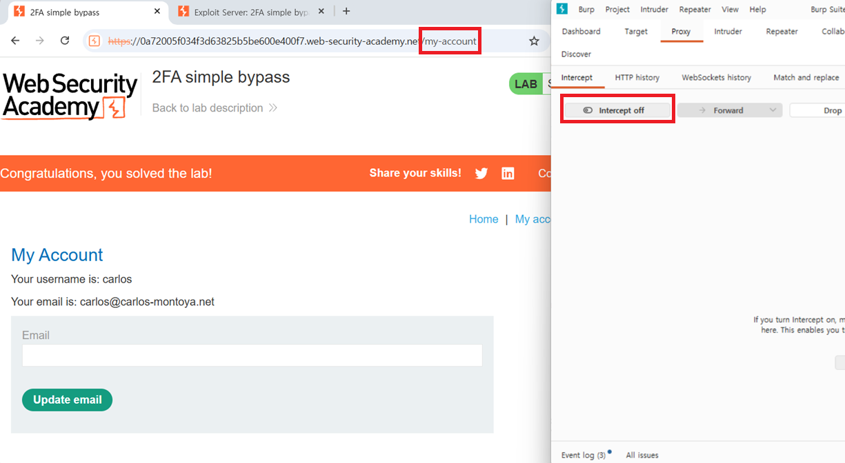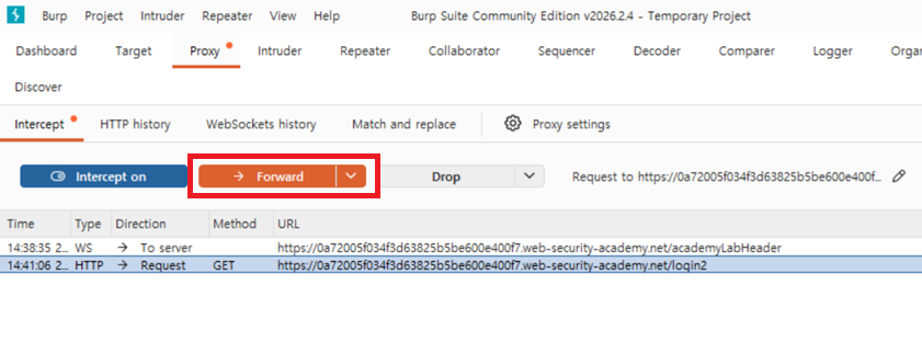 6. 주소 내용 바꾸고, 인터셉트 오프 선택하면 우회 성공