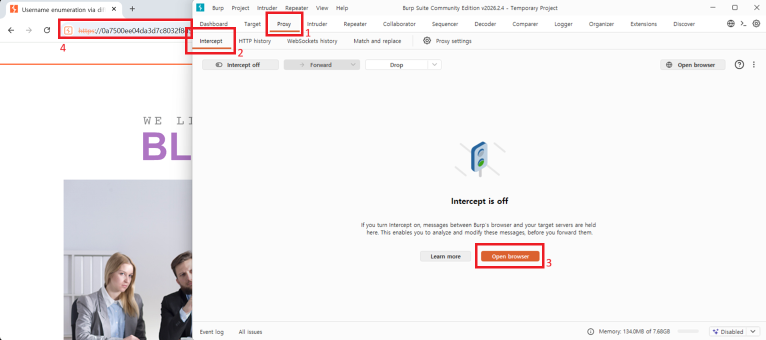1. 버프슈트 -> 프록시 -> 오픈 브라우저 -> 인터셉트는 오프 상태로 둔다