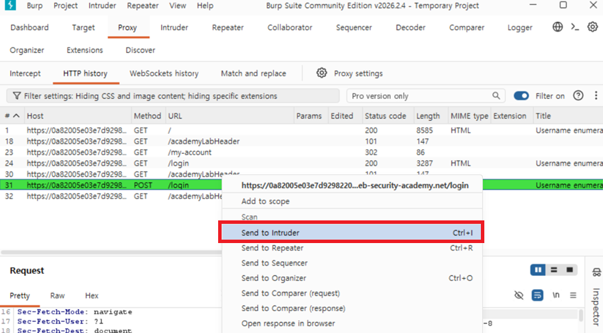 요청에서 매개변수 POST /login값을 강조 표시 하고 Burp Intruder로 보냅니다.