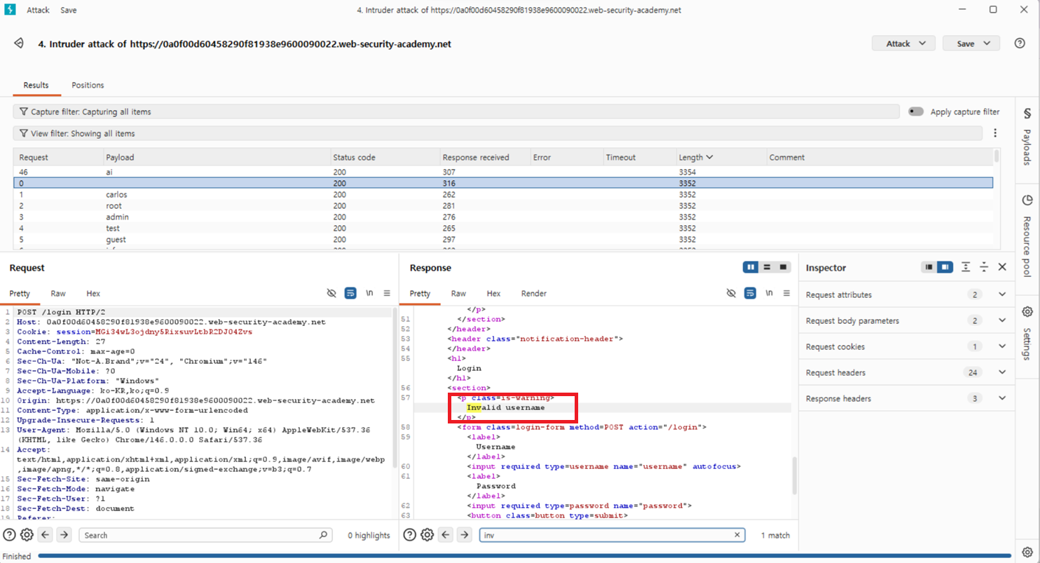 8. 공격이 완료되면 결과 테이블의 길이 열을 확인하세요. 열 헤더를 클릭하면 결과를 정렬할 수 있습니다. 항목 중 하나가 다른 항목보다 더 긴 것을 확인할 수 있습니다. 이 페이로드에 대한 응답을 다른 응답과 비교해 보세요. 다른 응답에는 Invalid username 메시지가 포함되어 있지만, 이 응답에는 Incorrect password가 포함되어 있는 것을 알 수 있습니다. 페이로드 열에 있는 사용자 이름을 기록해 두세요 .