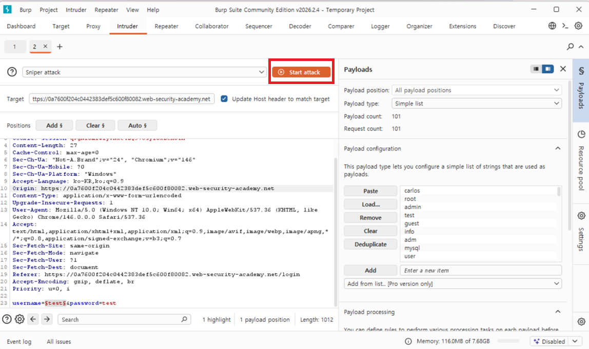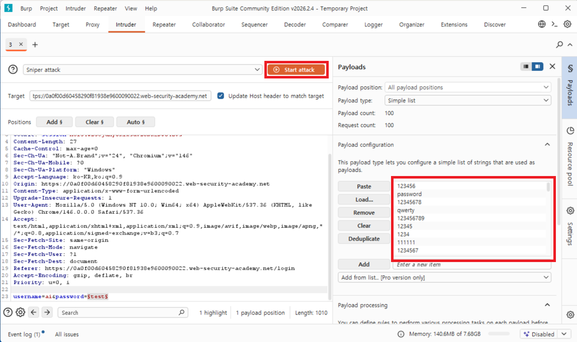 10. 페이로드 사이드 패널 에서 사용자 이름 목록을 지우고 후보 암호 목록으로 바꿉니다. start aattack을 클릭합니다.