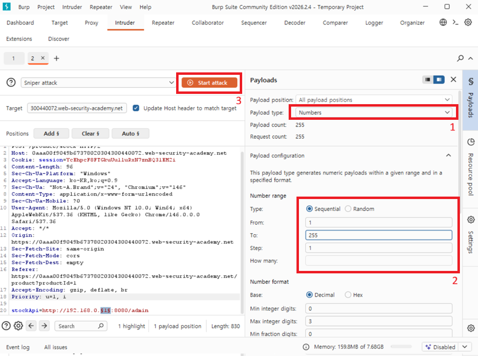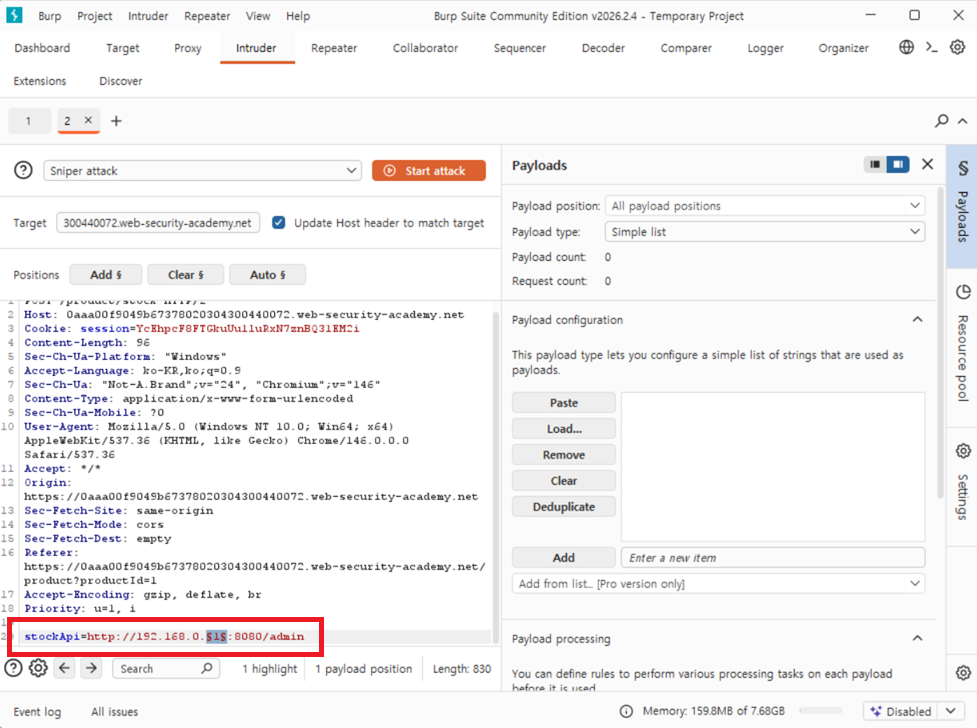 3. stockApi매개변수를 http://192.168.0.1:8080/admin로 변경한 다음 IP 주소의 마지막 옥텟(숫자 1)을 강조 표시하고 추가 §를 클릭합니다 .