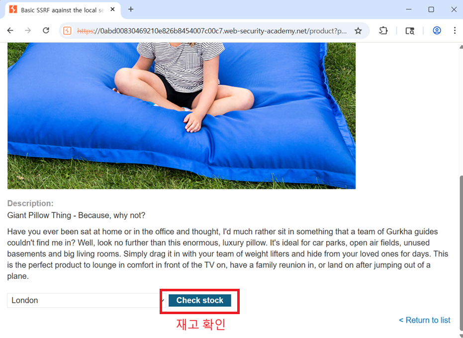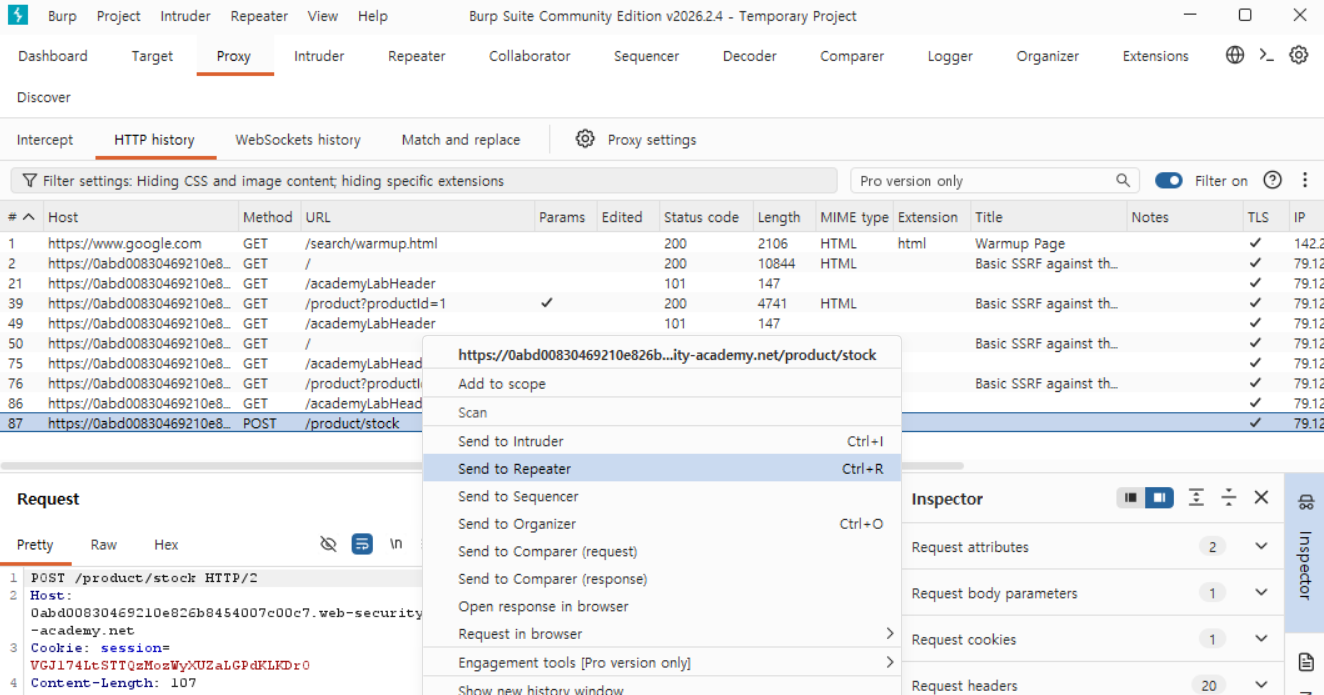 3. 제품 페이지를 방문하여 "재고 확인"을 클릭한 다음, Burp Suite에서 해당 요청을 가로채서 Burp Repeater로 보냅니다.