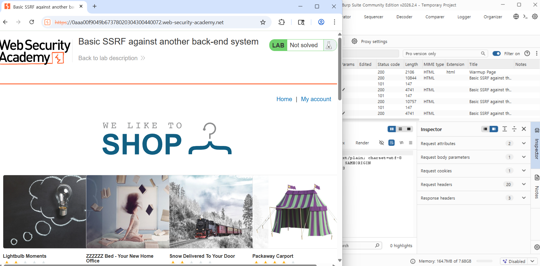 이 실습 문제를 해결하려면 재고 확인 기능을 사용하여 내부 192.168.0.X범위에서 8080포트의 관리자 인터페이스를 검색한 다음 이를 사용하여 사용자carlos를 삭제하십시오.