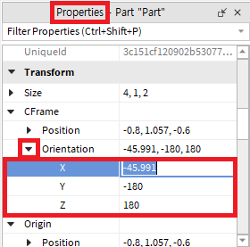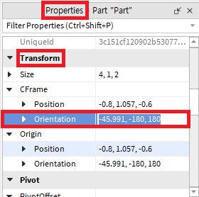 변형(트랜스폼: Transform)의 내림단추를 열면 씨프레임(Cframe)이 나타나는데 이 곳에서 내림단추를 열면 나오는 방향(오리언테이션: Orientation)에서 각도를 확인할 수 있고 직접 키보드로 값을 입력하여 각도를 변경할 수 있습니다.