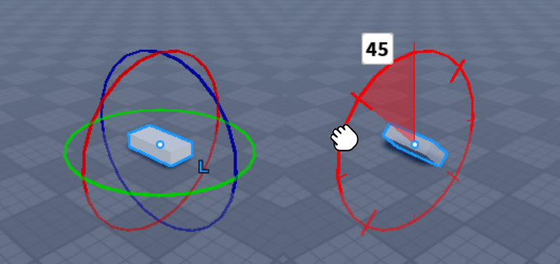 회전(로테이트: rotate)을 선택하면 아래와 같은 원이 나타납니다. 원을 누른 상태에서 드래그하면 파트(Part)가 드래그 시작점부터 회전한 각을 알 수 있습니다.