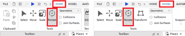 홈(HOME)탭에서 회전(로테이트: rotate)을 선택할 수도 있고 모델(MODEL)탭에서 회전(로테이트: rotate)을 선택할 수도 있습니다.