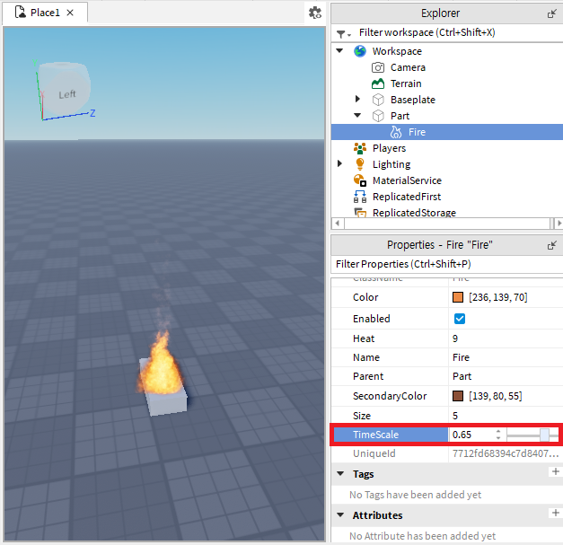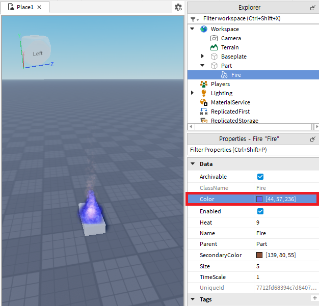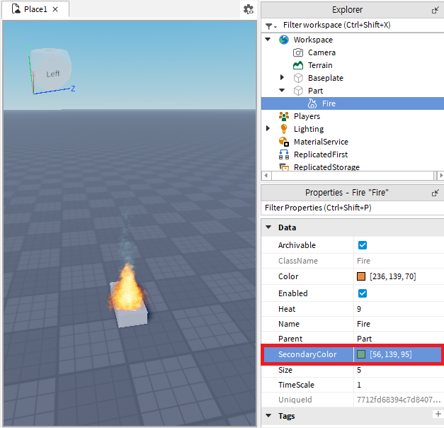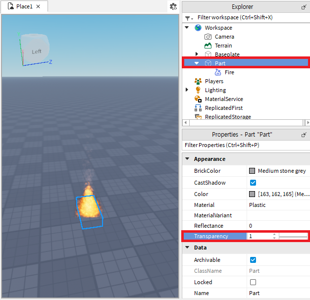 불 효과가 적용된 파트를 투명하게 만들 수도 있습니다. 투명하게 하고자하는 파트(Part)를 탐색기(익스플로러: Explorer)에서 찾아 선택한 후 속성(프로퍼티스: Properties)에서 투명도(트랜스퍼런시: Transperency)를 1로 바꾸면 파트가 투명해집니다.