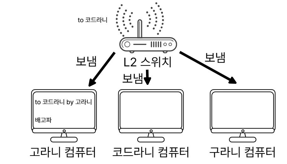 2) 그럼 공유기(L2 스위치, 집 인터넷 공유기)가 그 신호를 줏어서 가진 모든 MAC기기에 도착지점 정보를 쏜다.
