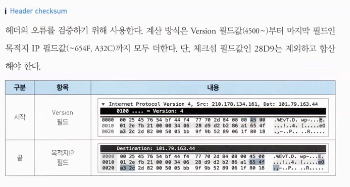 IP 헤더가 전송 중 손상되었는지 검사하는 값이다.