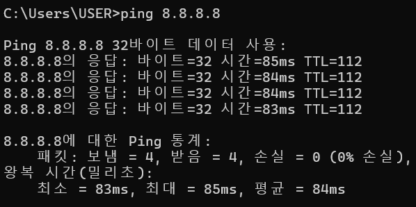 cmd(명령 프롬프트)에서 ping을 검색하여 TTL 값을 볼 수도 있다.