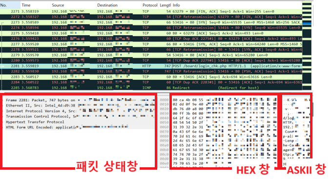 씬이 오간 모습과 왼쪽 패킷상태창(프로토콜 해석), 오른쪽 바이트창(핵스와 아스키코드 값)이 나온 모습이다.