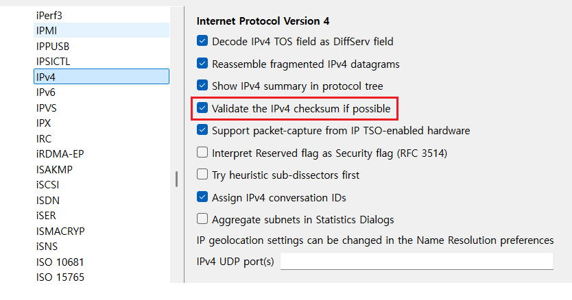 [편집] -> [설정] ->[프로토콜의 IPv4]->[체크섬]