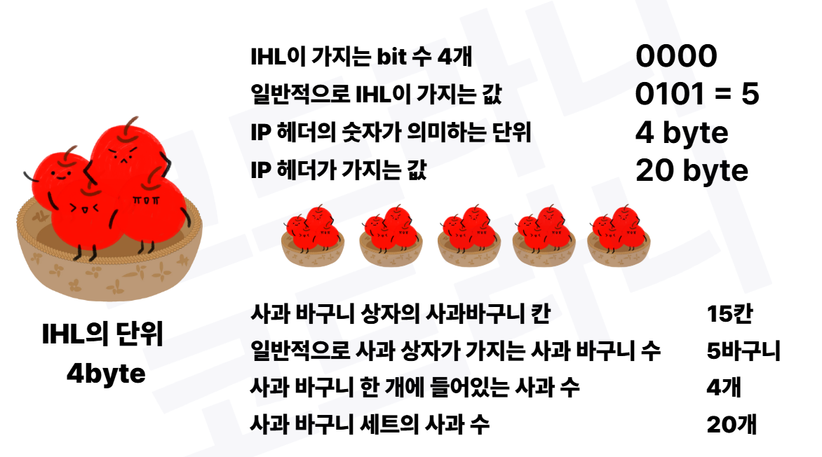 IP기본 헤더는 20바이트이다. (5 × 4바이트 = 20바이트)
